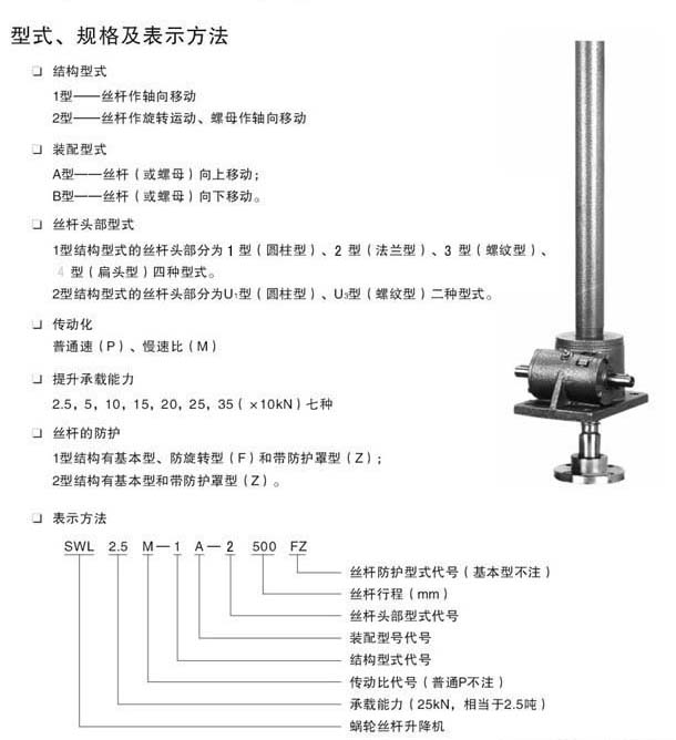概述 SWL系列蝸輪絲桿升降機又稱QWL升降機以及螺旋升降機廣泛應用于機械、冶金、建筑、水利設備等行業,具有起升、下降及借助輔件推進、翻轉及各種高度位置調整等諸多功能.SWL蝸輪絲桿升降機是一種基礎起重部件,具有結構緊湊、體積小、重量輕、動力源廣泛、無噪音、安裝方便、使用靈活、功能多、配套形式多、可靠性高、使用壽命長等許多優點。可以單臺或組合使用,能按一定程序準確地控制調整提升或推進的高度,可以用電動機或 其他動力直接帶動,也可以手動。它有不同的結構形式和裝配形式,且提升高度可按用戶的要求定制。 。該裝置可以自鎖