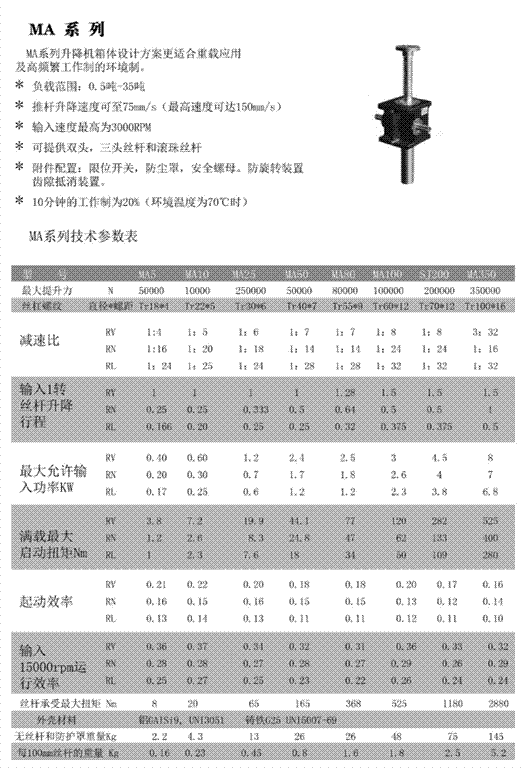 MA系列普通齒螺旋升降機(jī) 更適合重載應(yīng)用:重負(fù)荷,高頻繁工作制 額定負(fù)載: 0.5噸 -35噸 推桿升降速度可至75mm/s 最高輸入轉(zhuǎn)速: 3000rpm 工作制:30%(10分鐘運(yùn)行3分鐘) 可選擇雙頭,三頭絲杠配套,參數(shù)咨詢我公司 附件:齒隙抵消裝置,防轉(zhuǎn)轉(zhuǎn)置,安全螺母,防塵罩,磁感應(yīng)限位開關(guān)
