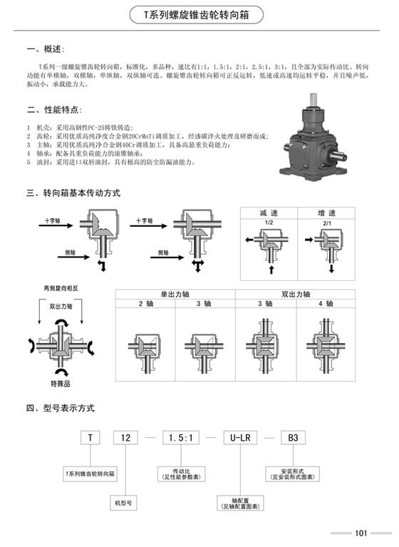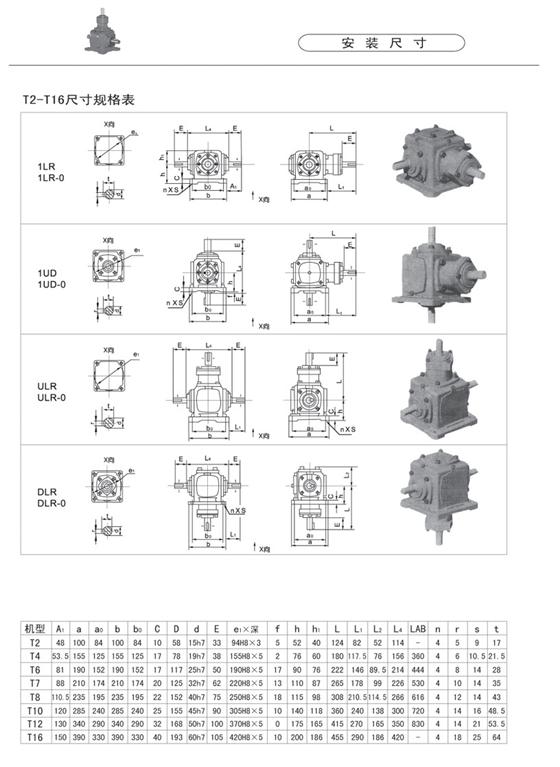 產(chǎn)品型號:T2、 T4 、T6 、T7 、T8、 T10、 T12、 T16 、T20、 T25 詳細說明:t系列螺旋傘齒輪,采用軸輸入,軸輸出結(jié)構(gòu),可單軸、多軸輸出,可正反方向旋轉(zhuǎn),結(jié)構(gòu)緊湊,占用空間小。因本公司專業(yè)生產(chǎn)銷售各類減速機及支架,大小品種規(guī)格繁多,價格按型號及規(guī)格的不同而不等,而在網(wǎng)上不能將同一系列的多個型號、多種規(guī)格一一列出