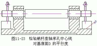 蝸桿座基準面D可用專用研具刮研,研點應為8~10/25×25mm2。檢驗軸承中心線對D面的平行度,如圖11—23所示,符合要求后裝入蝸桿,配磨調(diào)整墊片(補償環(huán)),以保證蝸桿軸線位于蝸輪的中央截面內(nèi)。與此同時,徑向調(diào)整蝸桿座,達到規(guī)定的接觸斑點后,配鉆鉸蝸桿座與底座的定位銷孔,裝上定位銷,擰緊螺釘。側隙大小的檢查,通常將百分表測頭沿蝸輪齒圈切向接觸于蝸輪齒面可工作臺相應的凸面,固定蝸桿(有自鎖能力的蝸桿不需固定),搖擺工作臺(或蝸輪),百分表的讀數(shù)差即為側隙的大小。