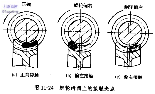 蝸輪齒面上的接觸斑點應在中部稍偏蝸桿旋出方向,如圖11—27a所示,若出現(xiàn)圖11—23b、圖11—23c的接觸情況,應配磨墊付片調(diào)整蝸桿位置使用權其達到正常接觸。接觸斑點長度,輕負荷時一般為齒寬的25%~50%,不符合要求時,可適當調(diào)節(jié)蝸桿座徑向位置。全負荷時接觸斑點長度最好能達到齒寬的90%以上。
